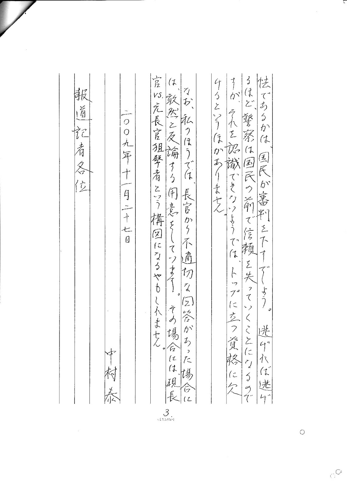 (弁護士経由)報道機関宛て書状